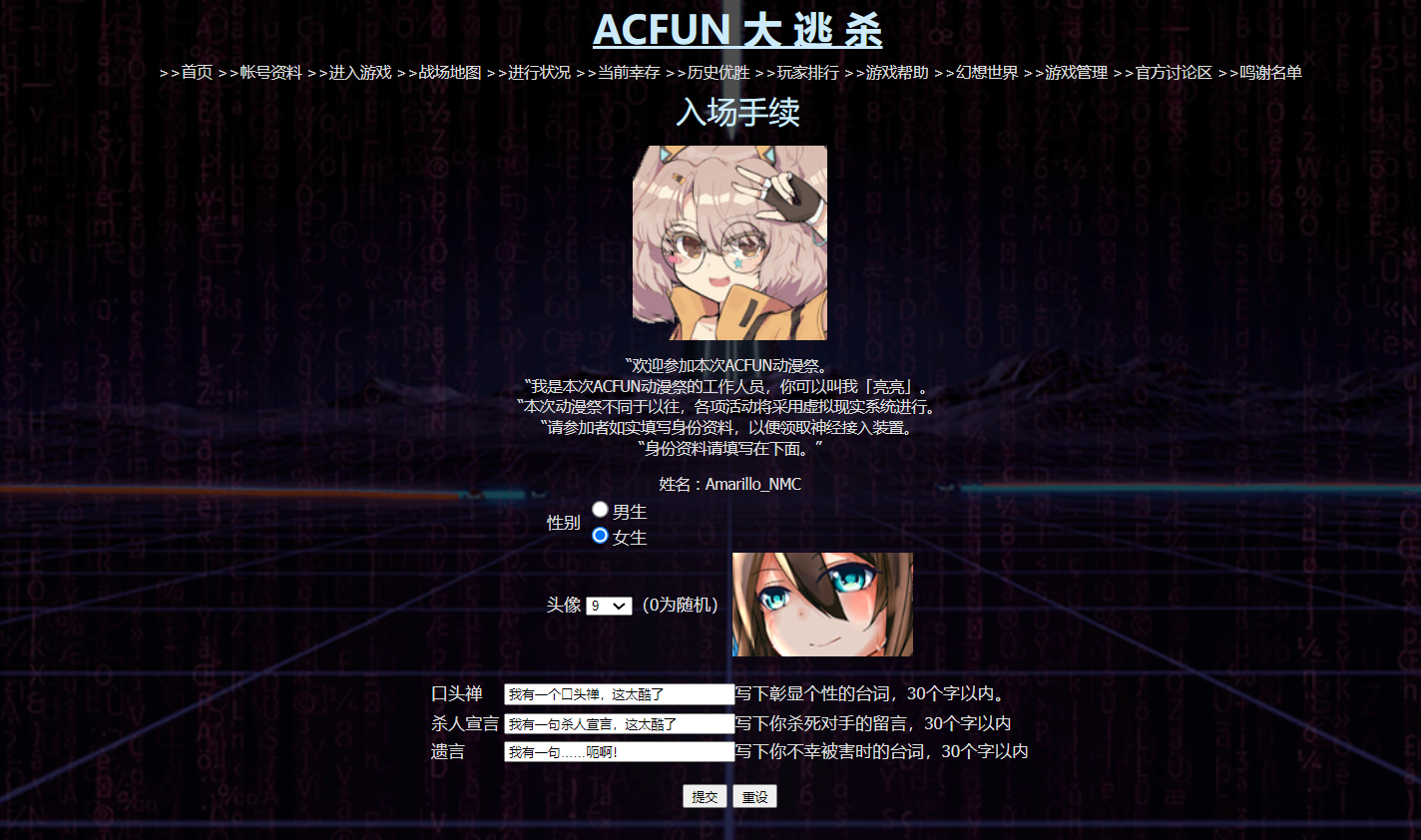 在加入一局新游戏时,首先会进入入场手续 页面,在这个页面可以即时修改自己选用的头像、性别、口头禅与头衔等。