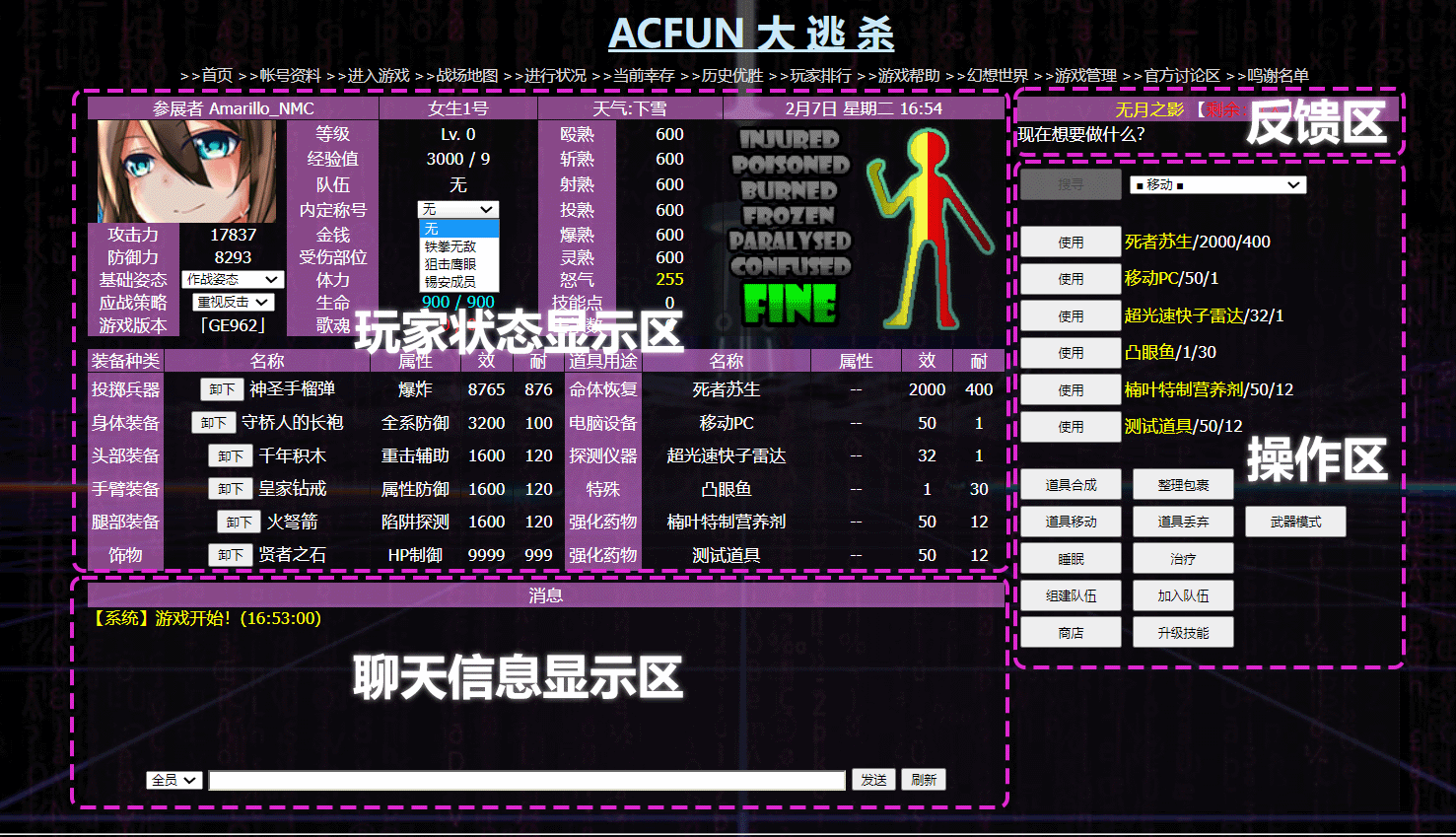 玩家的等级、内定称号、攻防数据、熟练度、受伤状况等等各种数值,以及身上装备和包裹道具的界面。